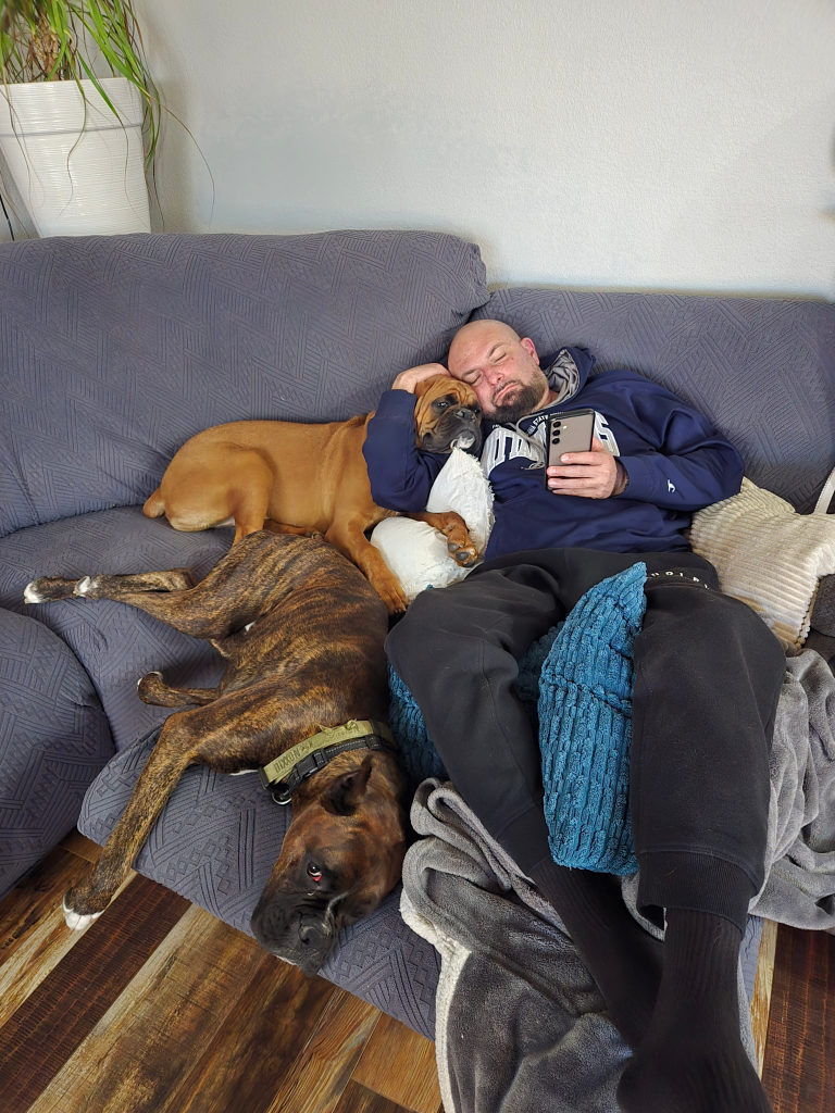 Our Boxers live with us — they are part of our daily life. Puppies are handled, loved, and exposed to normal household sounds and interaction from day one. This helps develop confident, well-adjusted dogs ready for family life.
