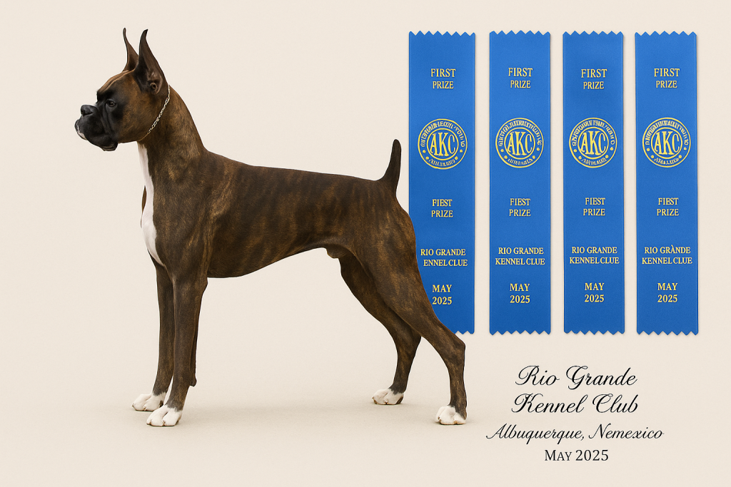Beyond his impressive pedigree and accomplishments, Hilo embodies the ideal Boxer temperament. He is energetic, confident, and playful, yet deeply affectionate and emotionally intuitive with his family. His striking brindle coat, balanced build, and athletic frame—standing approximately 3 feet tall and 3½ feet long at 60 pounds—reflect both beauty and sound conformation.
